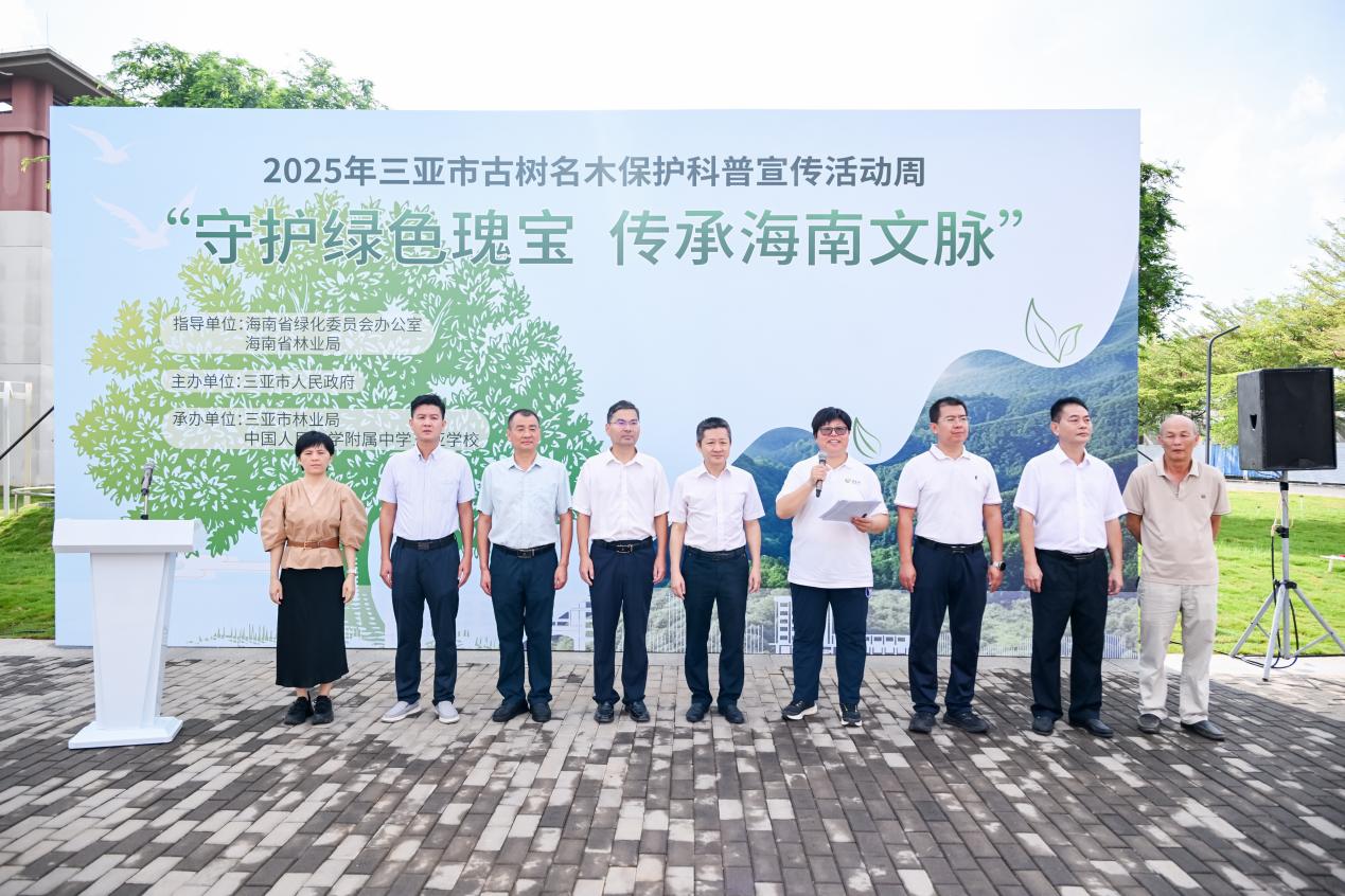 为深入贯彻落实习近平总书记“要把古树名木保护好,把中华优秀传统文化传承好”重要指示精神,讲好三亚古树名木保护故事,推动形成全社会关心关注古树名木的良好氛围,9月25日上午,“守护绿色瑰宝,传承海南文脉”三亚市2025年古树名木保护科普宣传周主场活动在中国人民大学附属中学三亚学校举行。活动由三亚市林业局党组书记、副局长曲环主持,三亚市人民政府副秘书长刘锡安出席并讲话,中国人民大学附属中学三亚学校党委书记史艳辉致辞。
