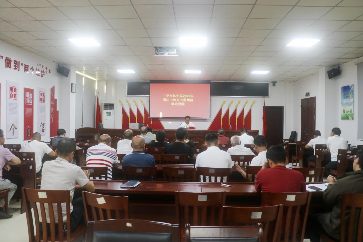 中秋、国庆将至,为深入贯彻中央八项规定精神学习教育,引导全体干部职工筑牢廉洁思想防线,确保节日期间风清气正、安全稳定,9月25日下午,三亚市林业局召开国庆、中秋“双节”前廉政提醒会,对值班值守、外出管理、纪律要求等方面进行安排部署。会议由市林业局党组书记、副局长曲环主持并讲话。