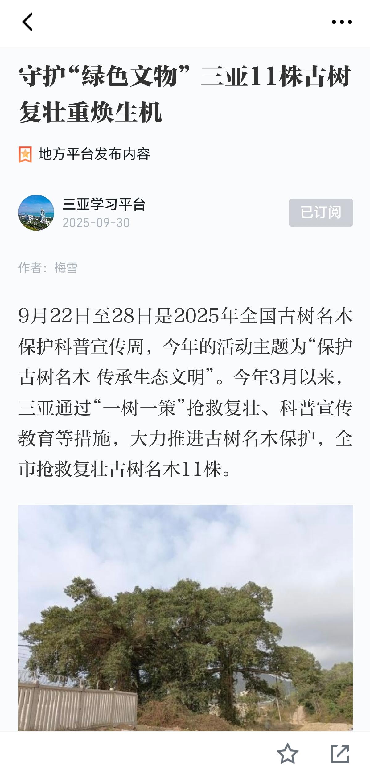 近日,“学习强国”三亚学习平台刊文报道我局工作《守护“绿色文物”三亚11株古树复壮重焕生机》,一株株古树的复苏,充分展示三亚林业在古树名木保护方面取得的显著成效,为全市古树复壮提供了可借鉴的经验做法。
